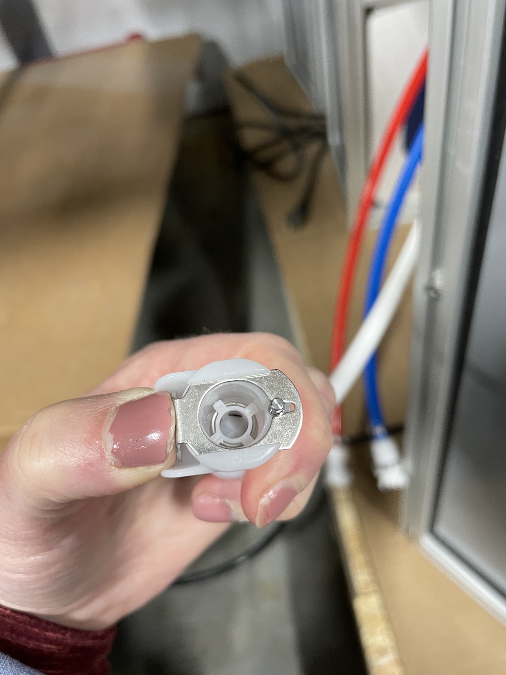 Tip: When putting the water system back together, push the tubes into the white connector with force until fully seated to prevent air leaks from depressurizing the system.