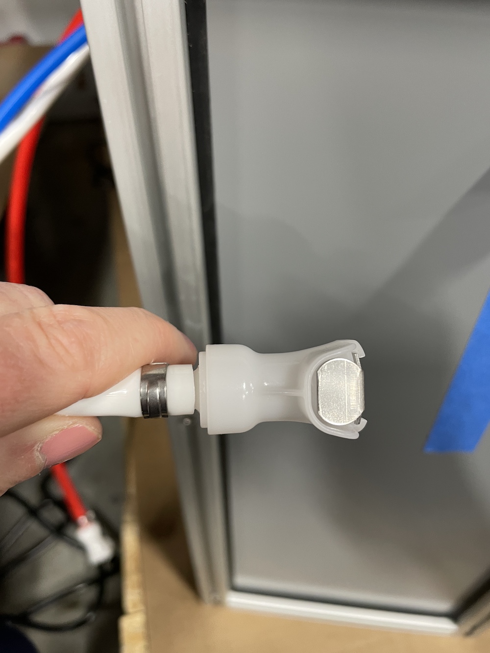5. Newer water systems come with a different style of connector. Press the silver tab in and pull the tubing out to disconnect. To reconnect, press the silver tab in and insert tubing.
