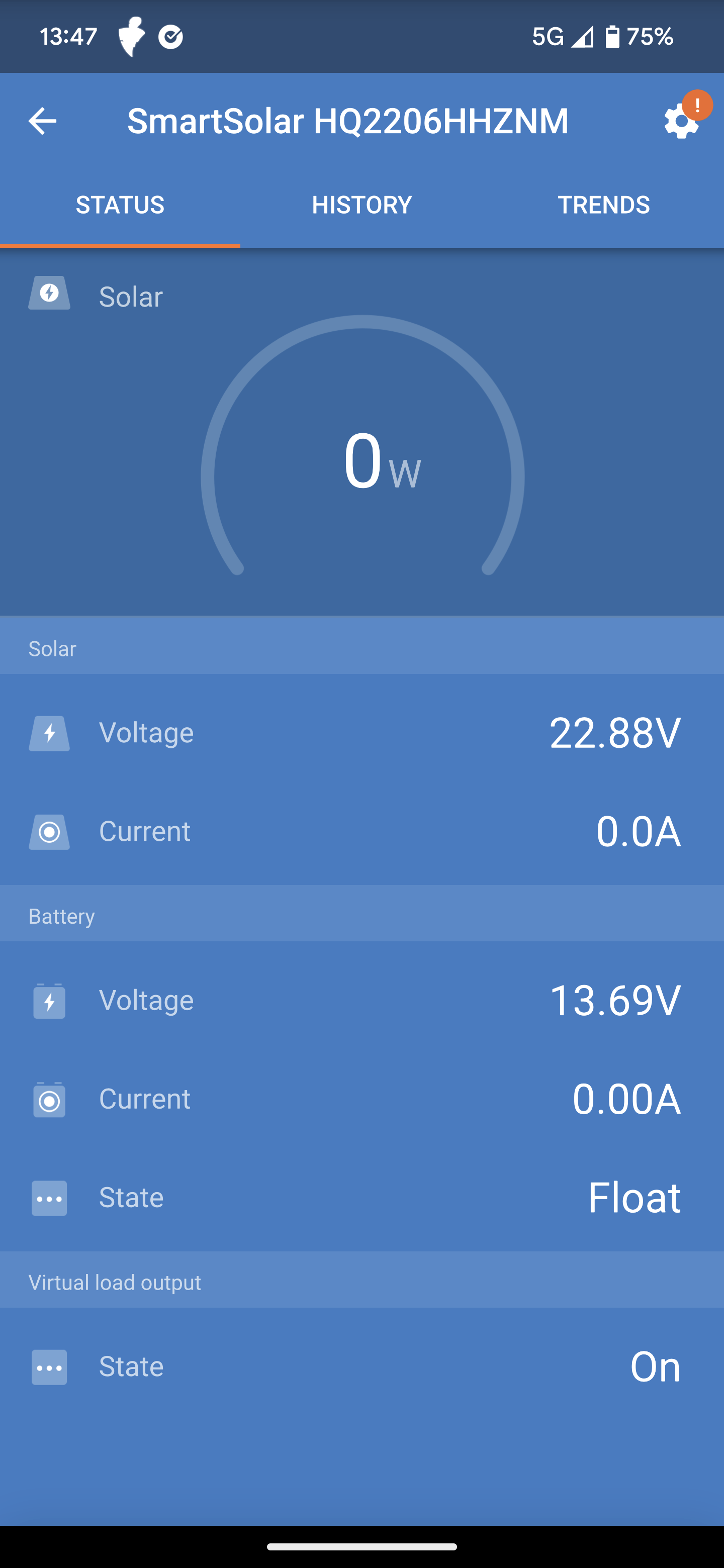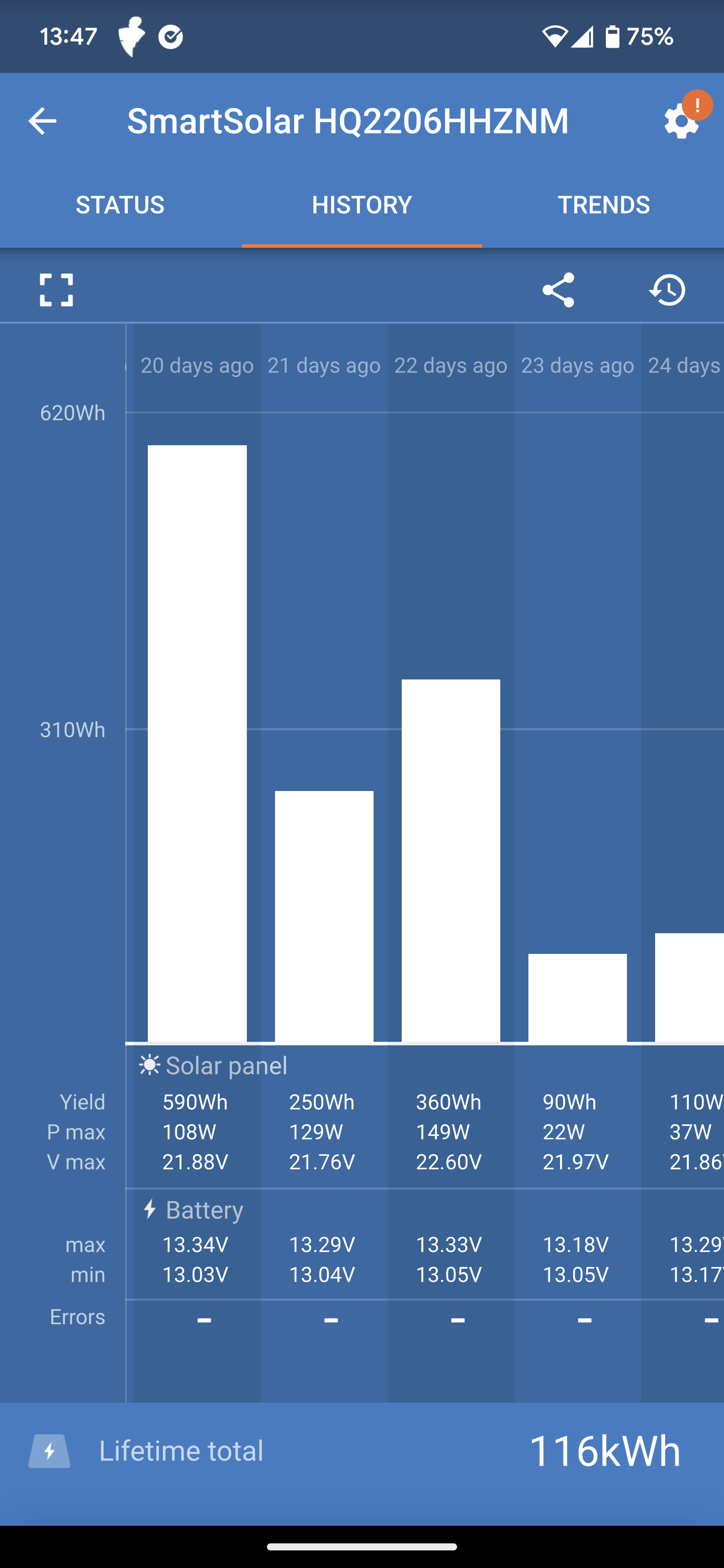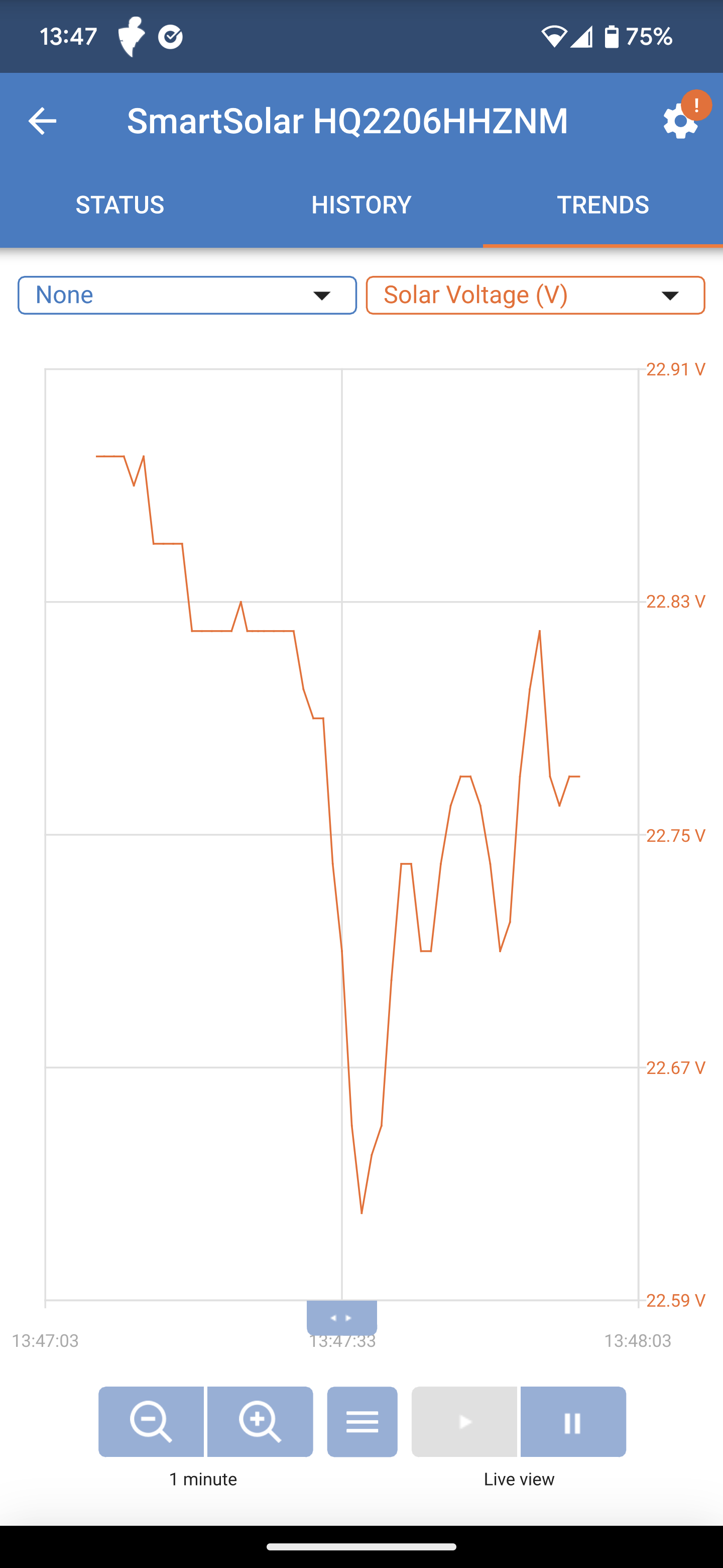 4. To test the app's readings, park the van in full sunlight with the solar panels unobstructed by branches, debris, etc. Monitor the app for a day or so and look for fluctuations in incoming amperage that are consistent with the available sunlight throughout the day. The screenshots below are examples of normal incoming solar amperage.