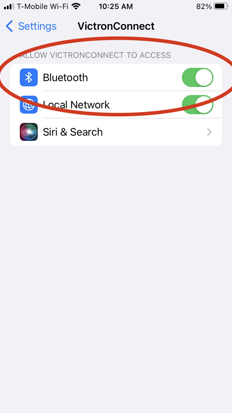 2. Once you have downloaded the app on your phone, make sure the Bluetooth settings for the VictronConnect app are turned On. This will be in your phone settings, not the app settings, as pictured below.