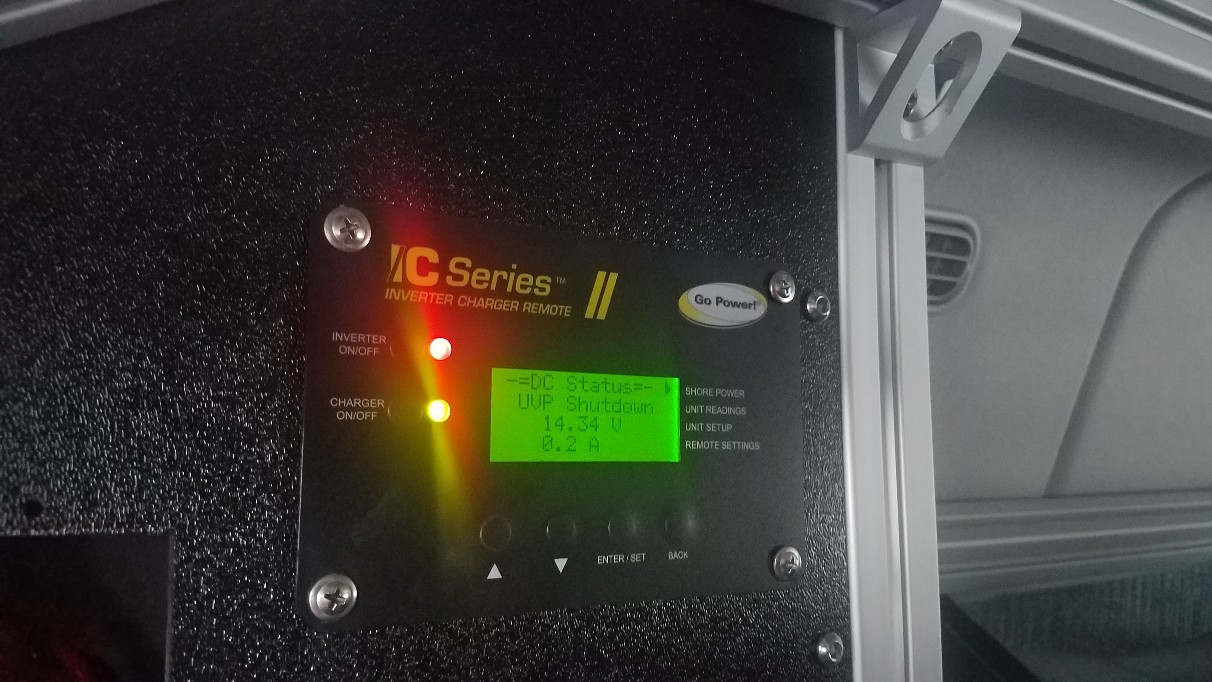 The GoPower IC2000 monitor displays a "UVP Shutdown" error message. The inverter stops working and will not power devices in the van.