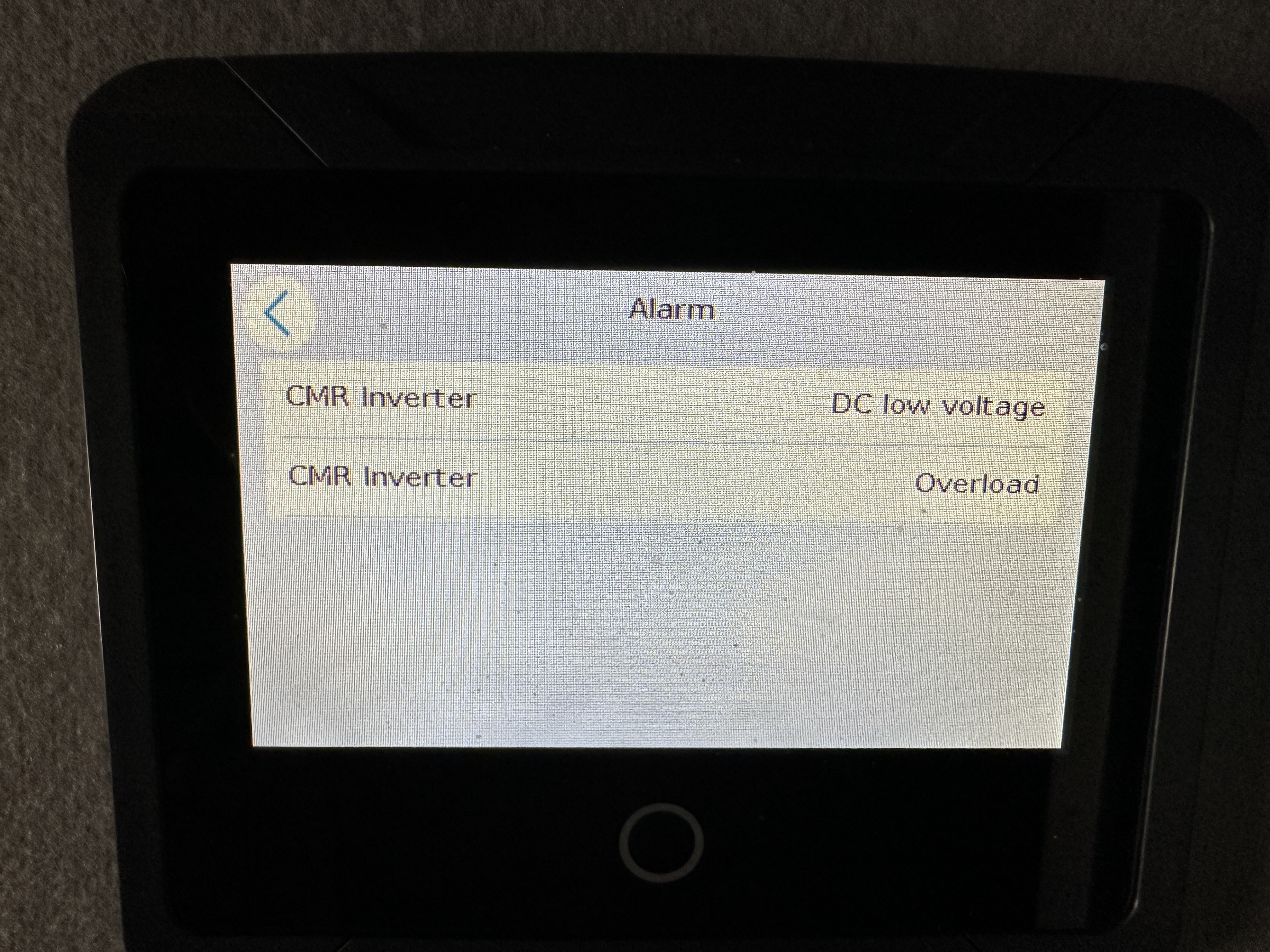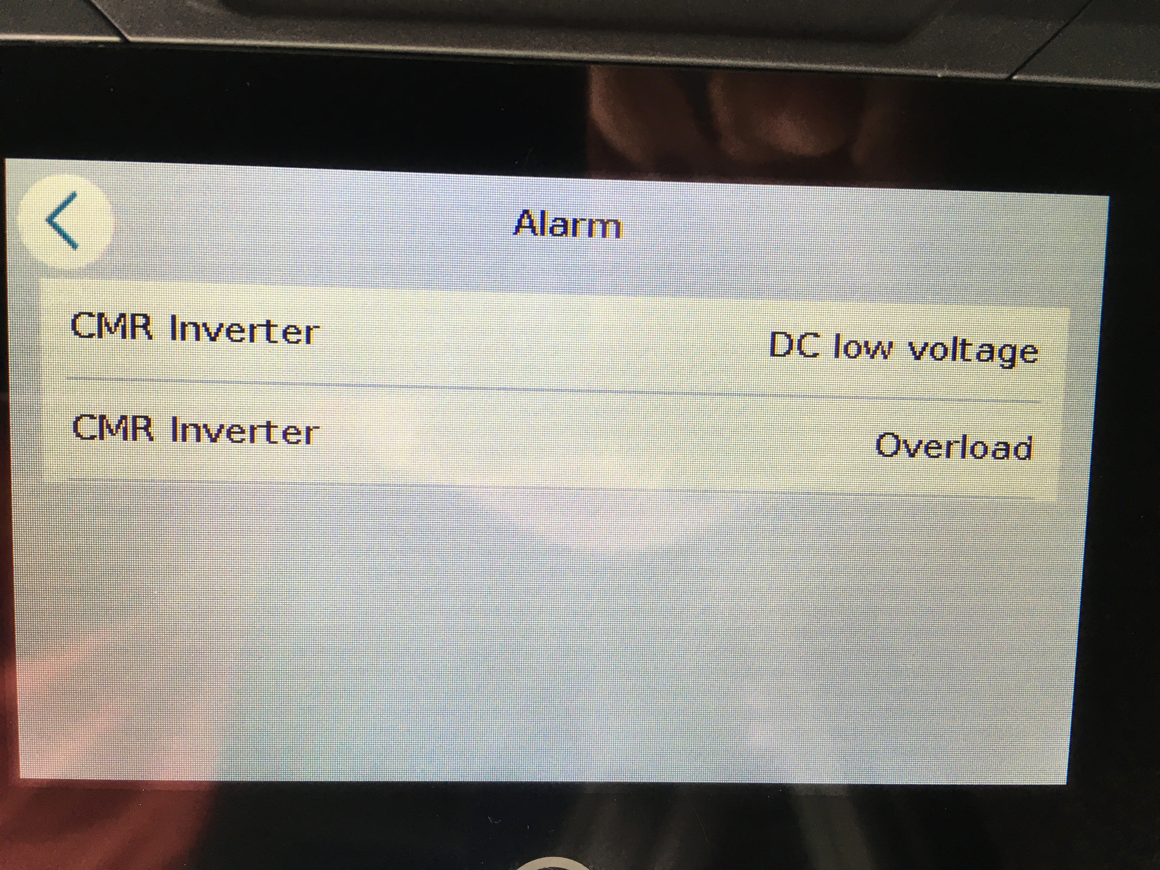 When turning the red Rear Battery Disconnect Switch (aka Kill Switch) to "Off," the Mastervolt Easyview 5 displays a "DC Low Voltage" alarm and an "Overload" alarm for the CMR Inverter.