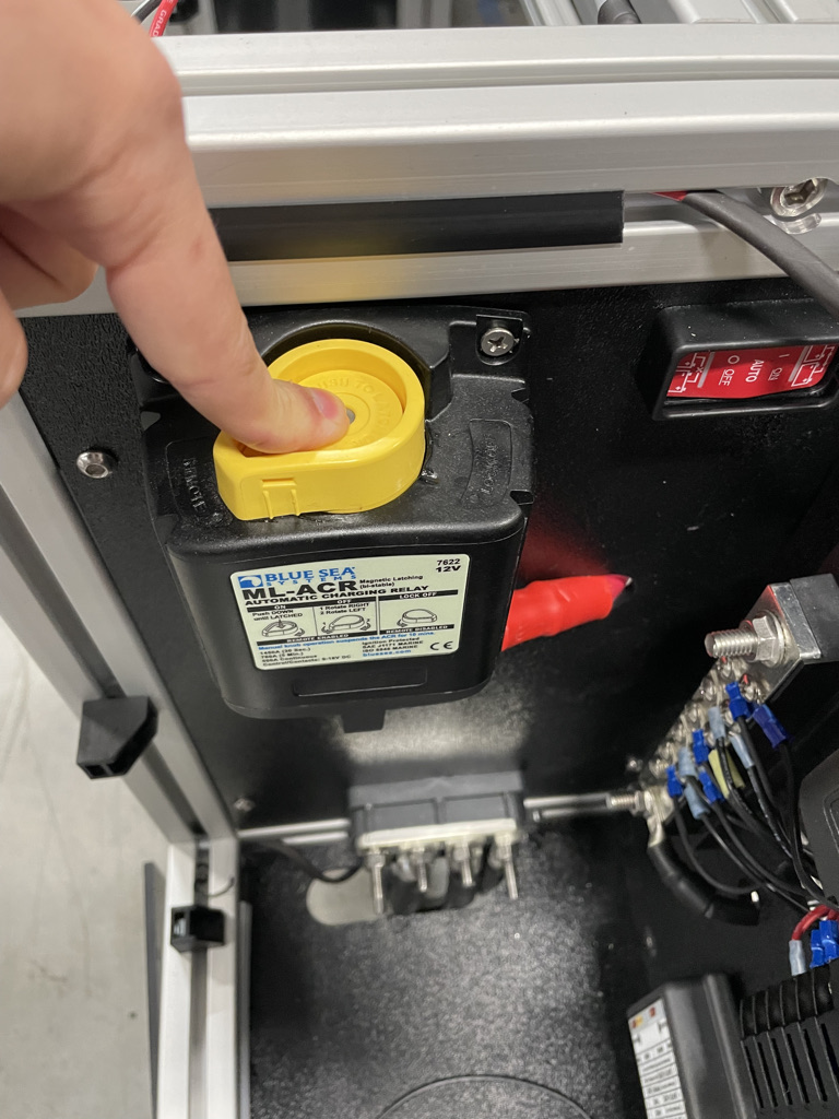 9. Make sure the switch is flipped to the "On" setting. The yellow button should be flush with its yellow exterior. Press the yellow switch button in. The relay is now connecting the battery systems and voltage should begin to equalize.