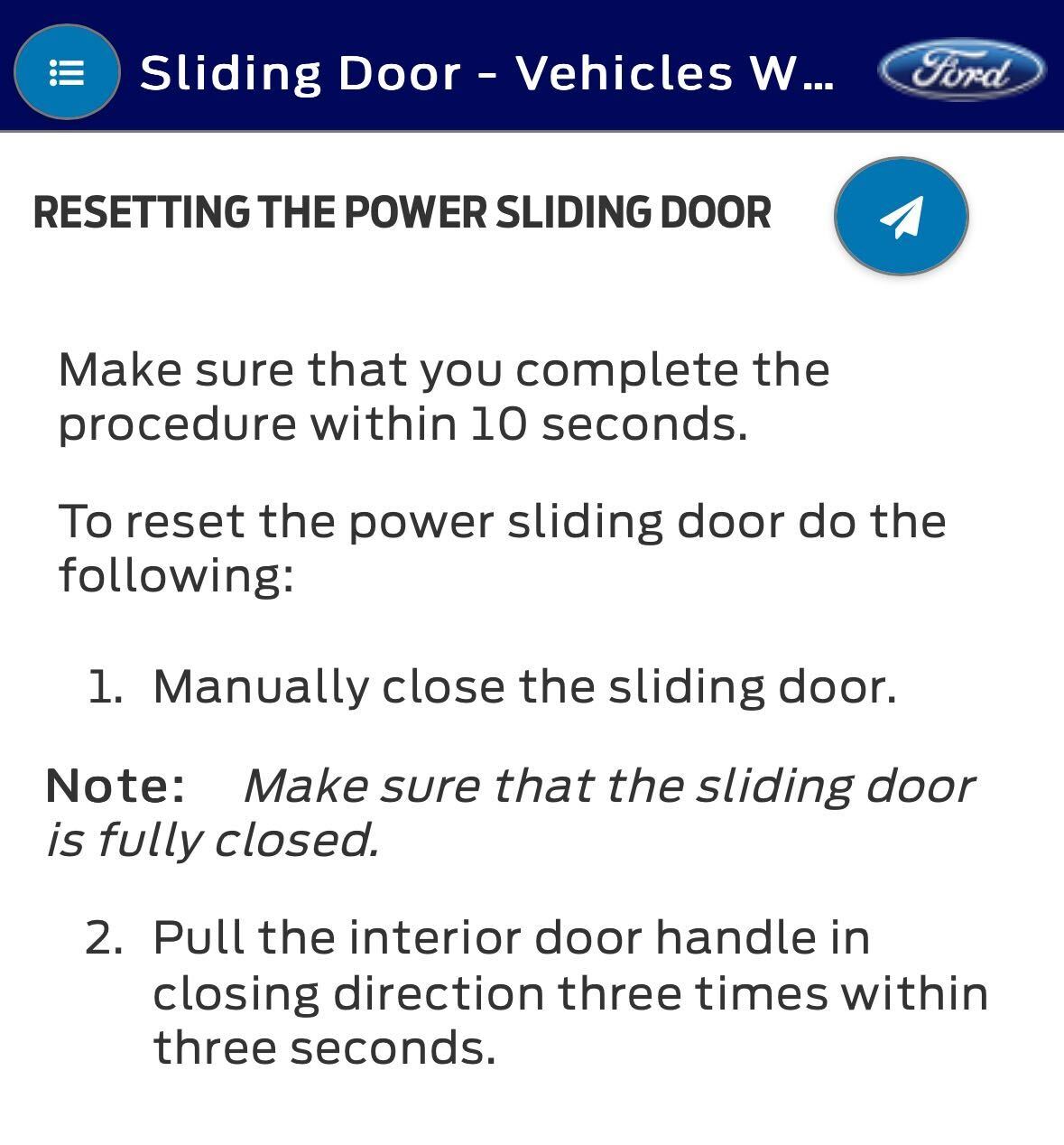 4. If steps 1 and 2 do not close the door, try resetting the power sliding door by following these instructions from the Ford user manual: