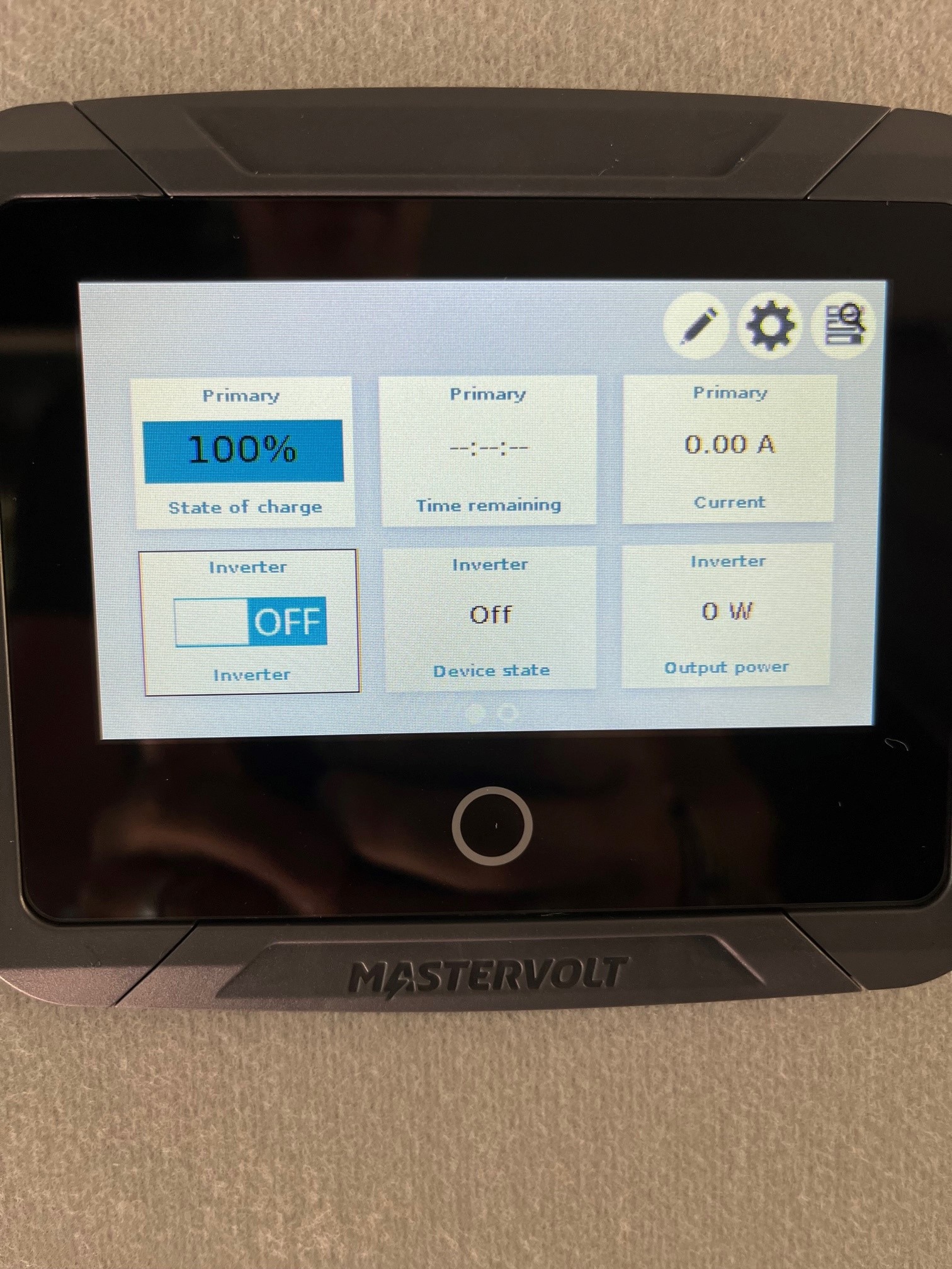 On the Mastervolt EasyView 5 Monitor, the "Primary - Time remaining" widget displays "--:--:--" instead of an actual amount of time.