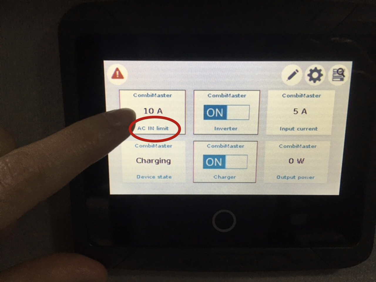 1. Swipe to the second page on in your Mastervolt inverter screen and press the "AC IN limit" button.