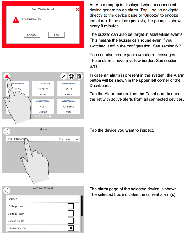 When an alert is active in the Mastervolt system, a red triangle icon with an exclamation point will appear on the screen. Please see the information below on what to do with these alert messages. If you have an alert message, please contact Vandoit and provide photos of the message. Some alerts cannot be cleared until certain parameters have been met. For example, the low battery alert will not clear until the battery has been charged to a healthy level.