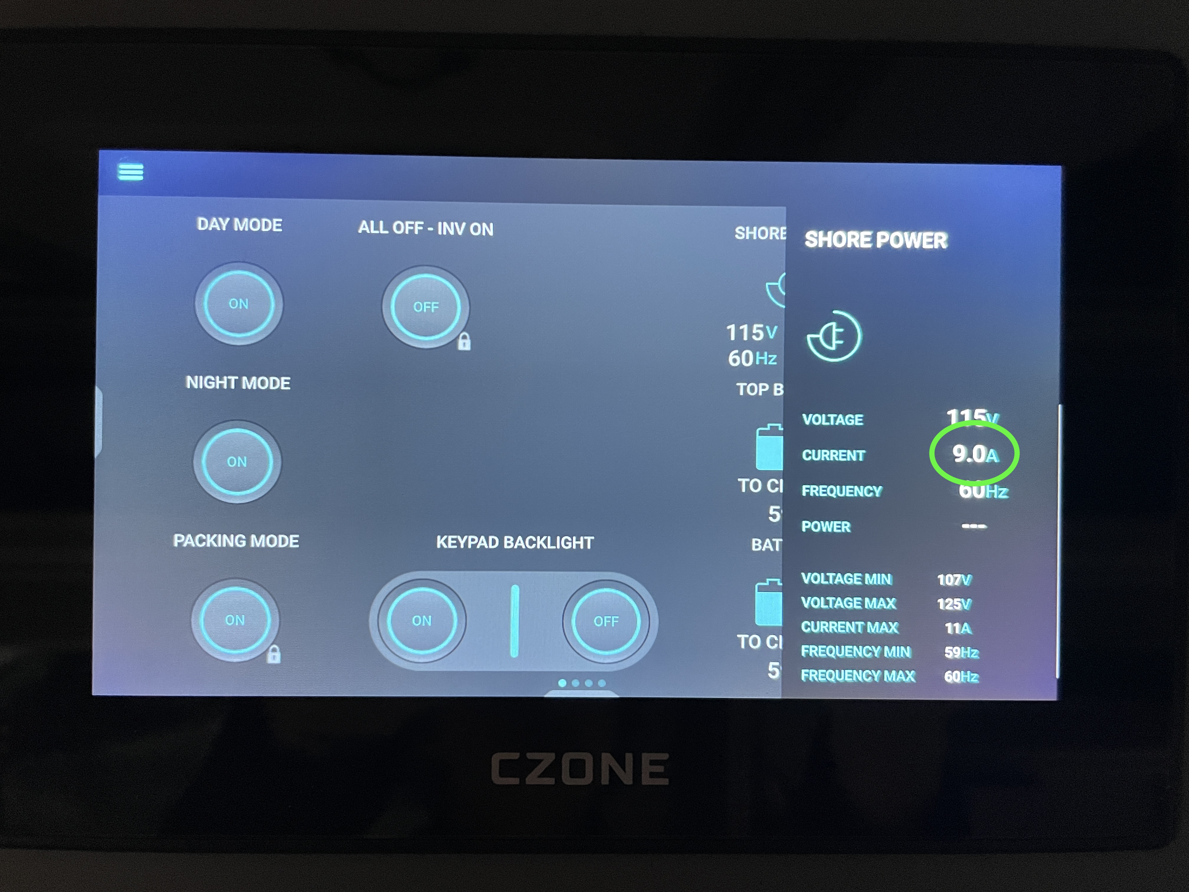If your Mastervolt lithium system has the Czone Touch 7 screen, find the shore power icon, which looks like an electrical plug inside of a partial circle. If shore power is charging, you should see an incoming amperage reading just below the icon or when you click the icon.