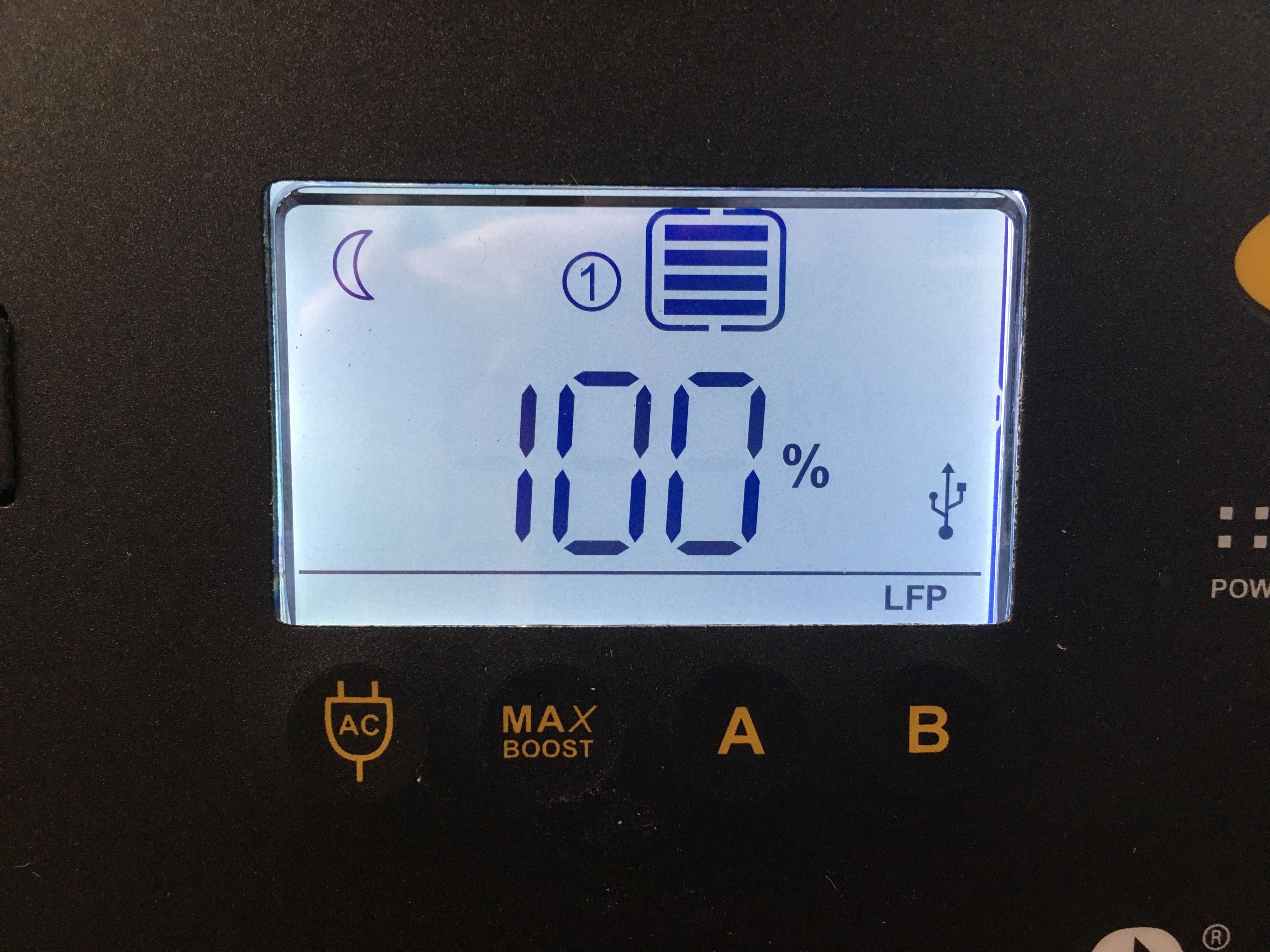 2. The A button should not be needed for your van's solar system. The B button allows you to toggle between several sets of data about your solar system: battery voltage, PV (Photonic Voltage) charging current, battery state of charge (displayed as a percentage), and the cumulative Amp Hours of solar power the system has collected (displayed as Ah or KAh). The circled 1 indicates that the monitor is displaying data about the batteries in the Vandoit power system.