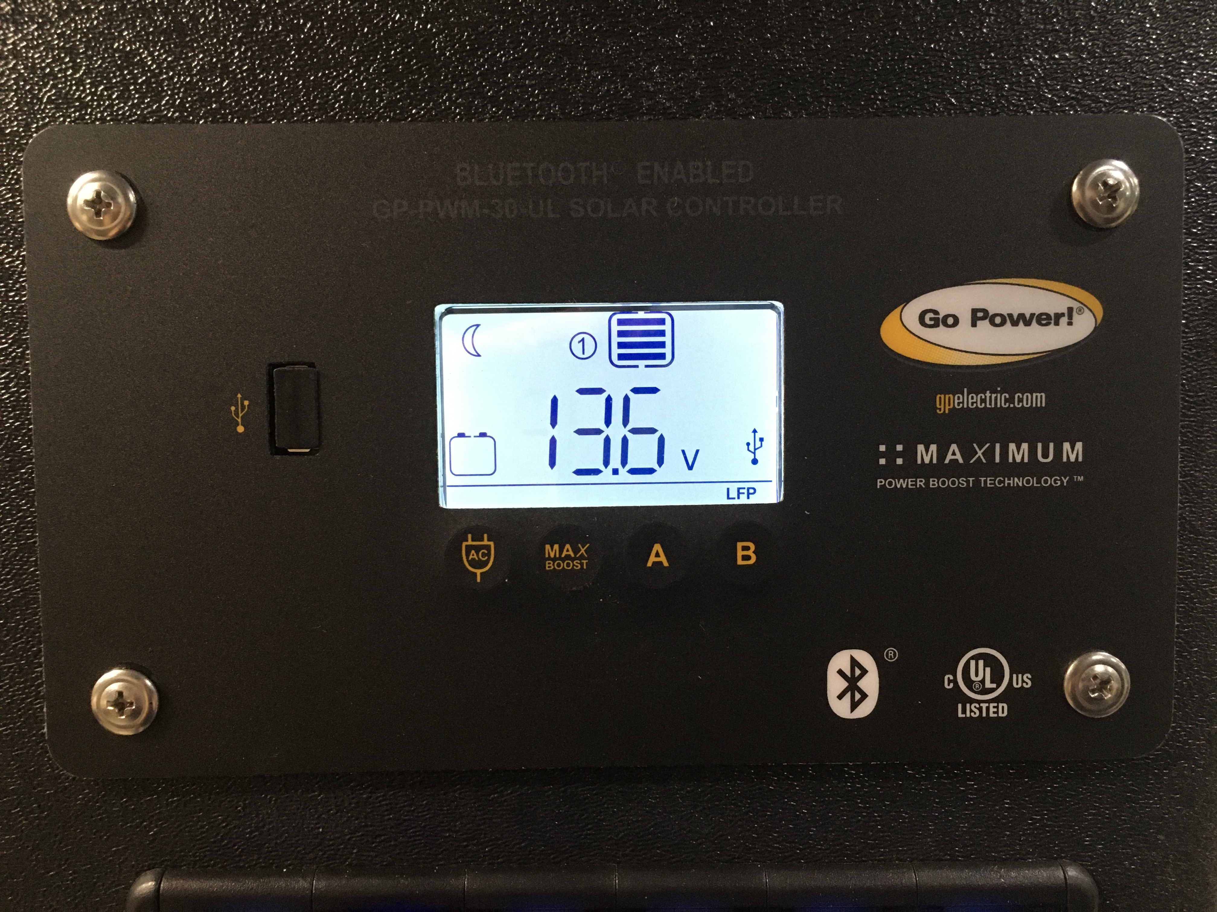 Note: The voltage indicated on the GoPower Solar controller may not be as accurate as the voltage displayed on the van's inverter screen, which can be found above or next to the sliding passenger door. Use the inverter screen's reading for most accurate, real-time voltage.