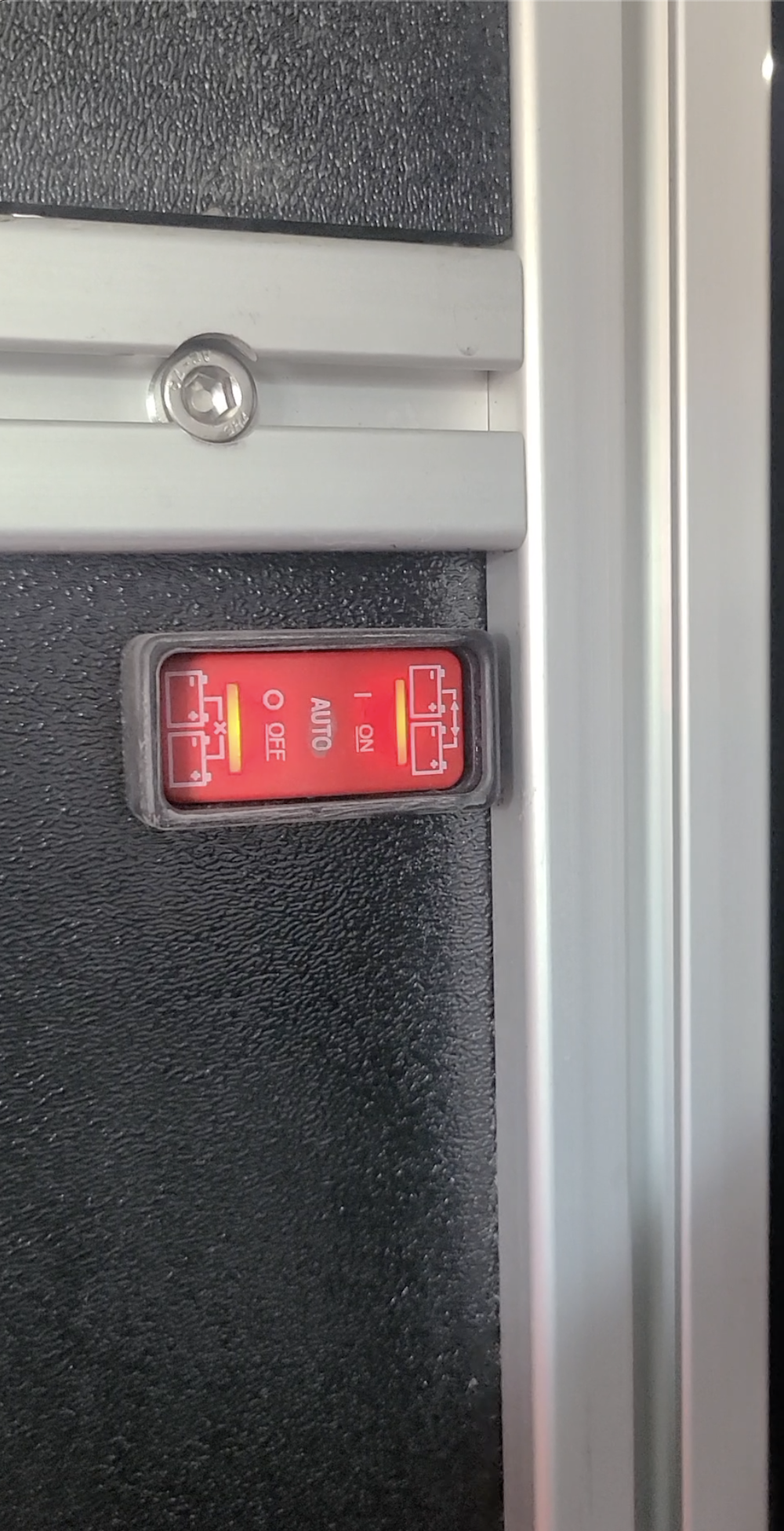 The red rocker switch should be set to "auto." To connect the Vandoit battery to the front Ford battery, flip the red switch to the "on" position. You should hear a click.