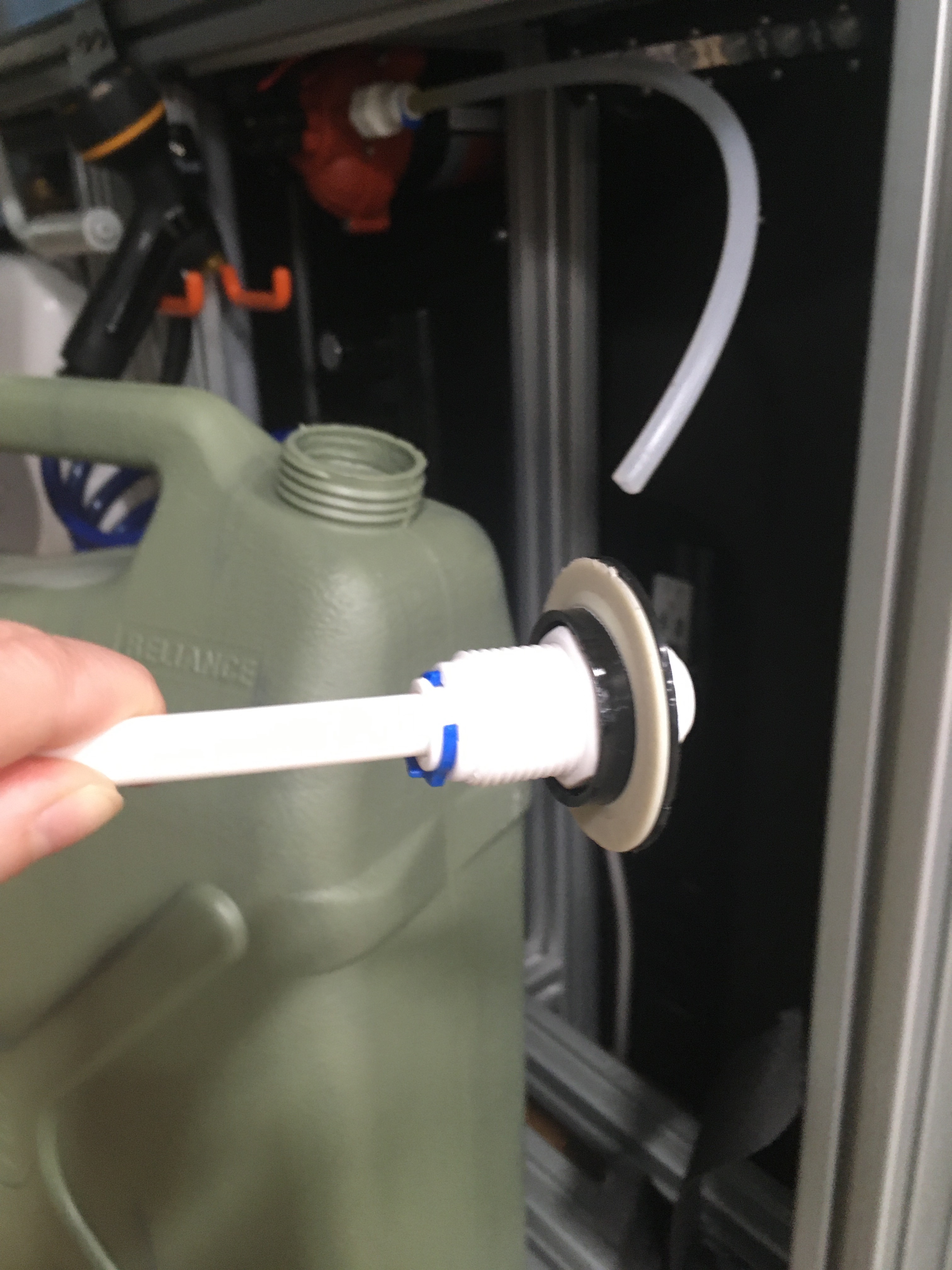 A. Unscrew the large black plastic nut from the mouth of the jerry can. Remove the interior black piece so you can access the white water line connector.