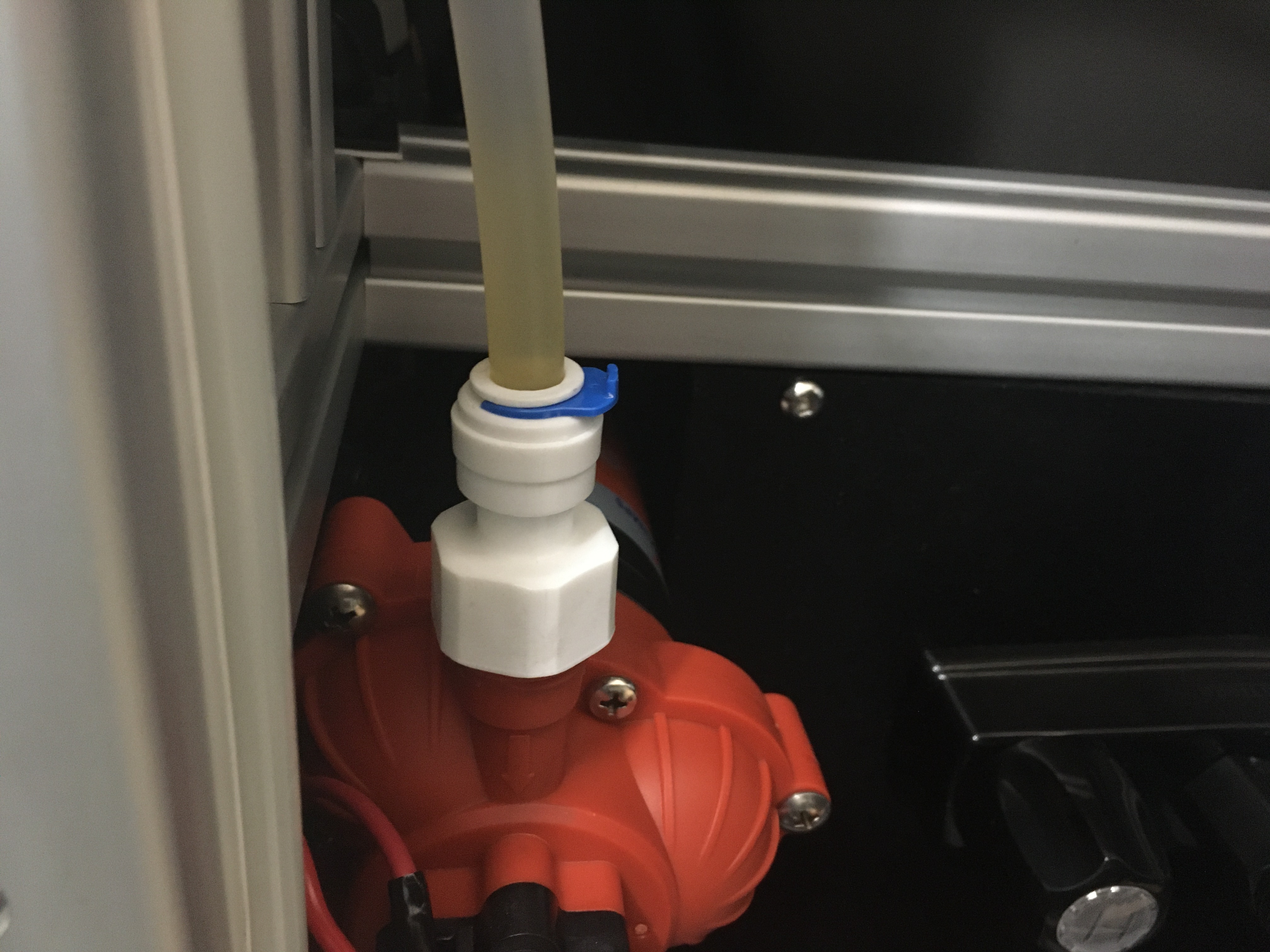 Note: If you have a 10 gallon tank you will have 8 blue clips in this section: 3 surrounding the T-fitting, 2 on each quick connect valve, and 1 on the quick connect fitting connected to the water pump.